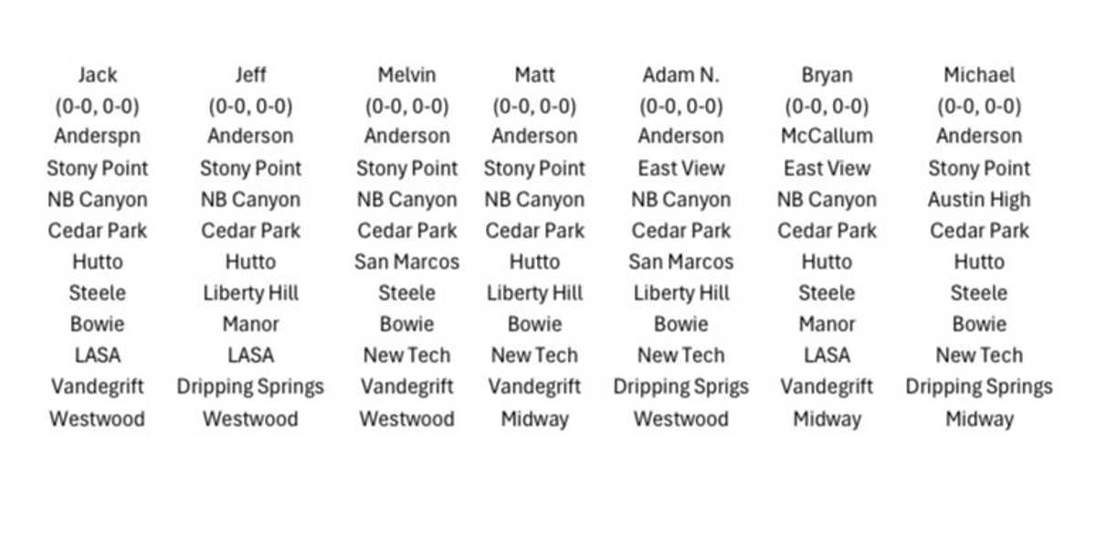 So, this year, we’re gonna take it public. Each week, the PxP guys and/or producers from our Austin crews will attempt to pick the winner of every Austin-area game we’re broadcasting on VYPE Live.