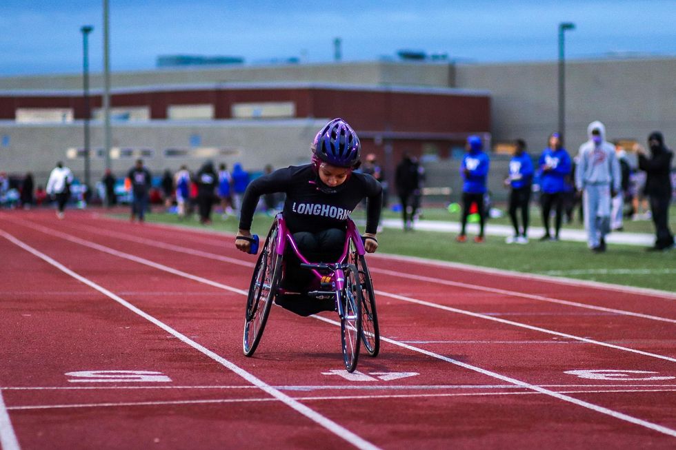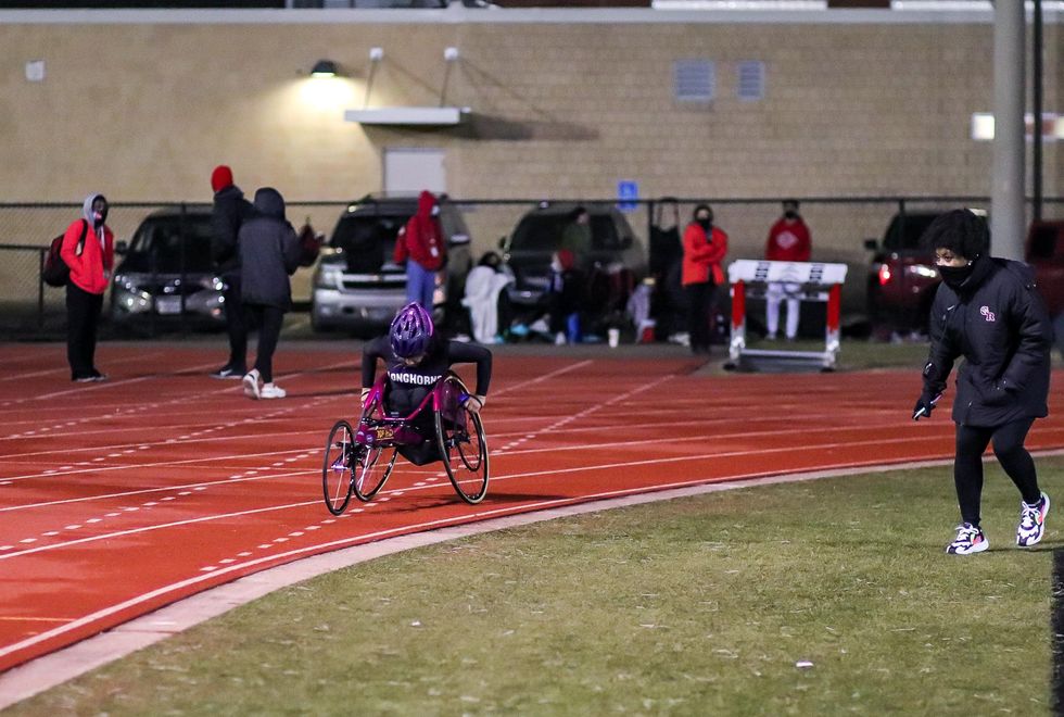 The rockstar duo Coach Jones and Skylar Herrera (10) posing up before Herrera sprints the 100m wheelchair race.