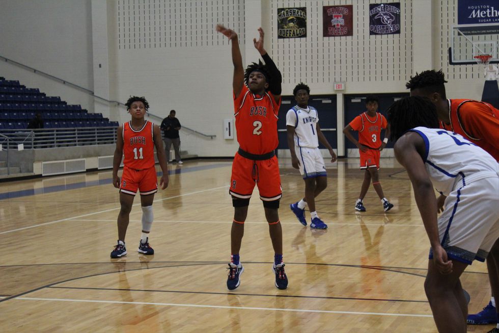 The George Bush Broncos took on the Elkins Knights Tuesday night coming away with a 55-46 victory. A slow start led to a 7 point deficit after 1 (17-10), before pulling to within two at half 27-25. When the Broncos came back out from halftime they were fired up and ready to play. Through out the 2nd half the Broncos stayed ahead of the Elkins Knights, ending the 3rd quarter ahead 37-34. The Bush Broncos won and closed the game with dunks from Danny McAdory (#24) and Brandon Love (#40) (Broncos). Leading the way for the Broncos was D. McAdory (#24) w/ 18 points, B. Joe (#11) w/ 15 points, B. Love (#40) w/ 9 points, and DJ Stewart (#2) w/ 7 points. Leading the way for the Elkins Knights was J. Fanuiel (#32) w/ 22 points, S. Bell (#1) and K. Glover (#12) w/ 6 points, and C. Johnson (#0) and K. Abushaaban (#33) w/ 4 points.