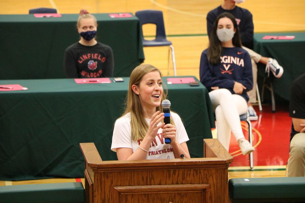 The athletes each took the podium for a short speech in front of a limited crowd of family members and coaches. Each student was allowed to invite five loved ones to celebrate, with the addition of the event being live-streamed for those who could not be present.