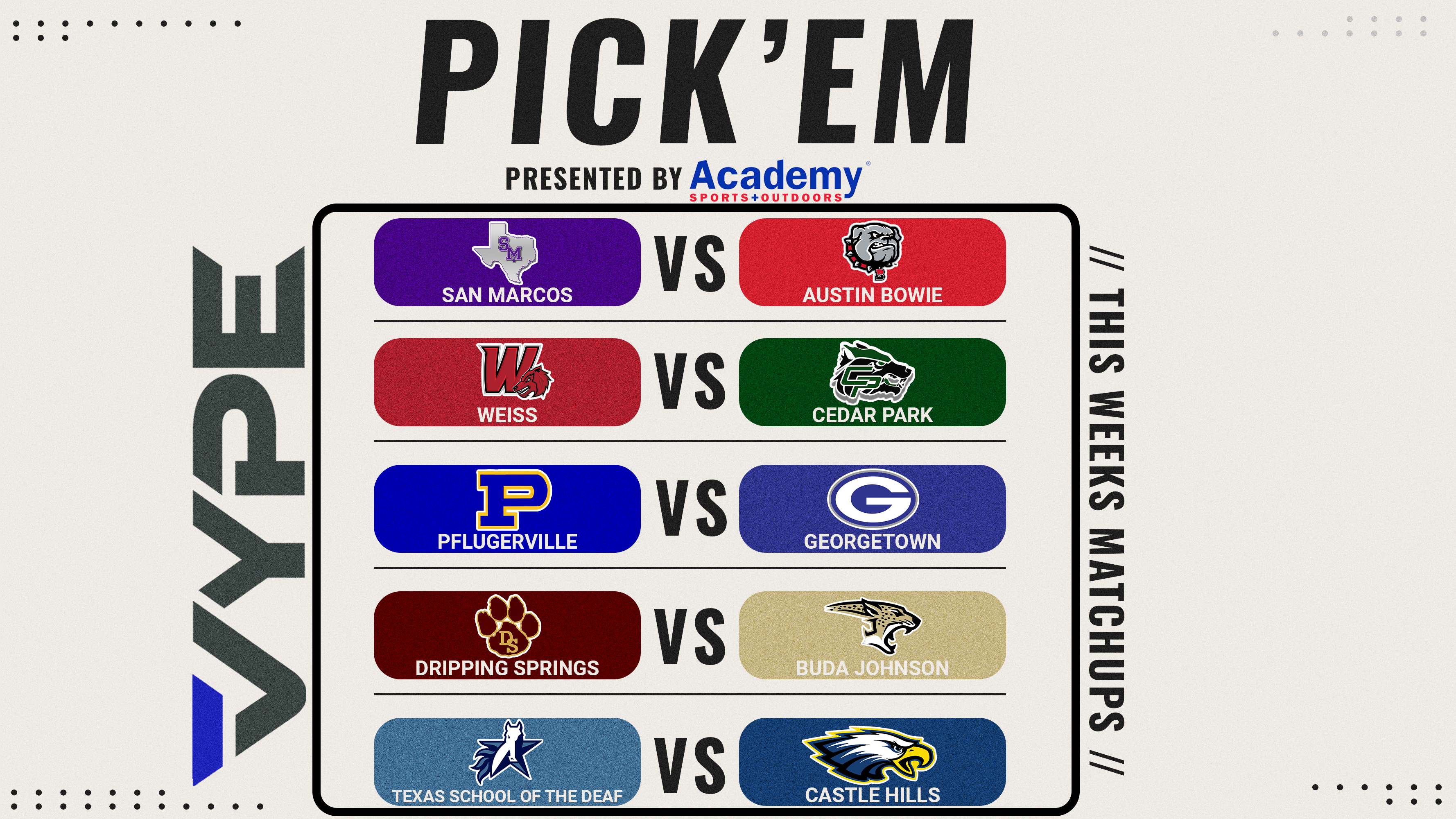Each week, VYPE Employees Josh W., Scott, Shana and Josh K, along with VYPEU Ambassador Will Turboff will make their picks from 5 different games for both Austin and San Antonio and keep track of their records throughout the year to see who can be the Pick 'em Champ.
