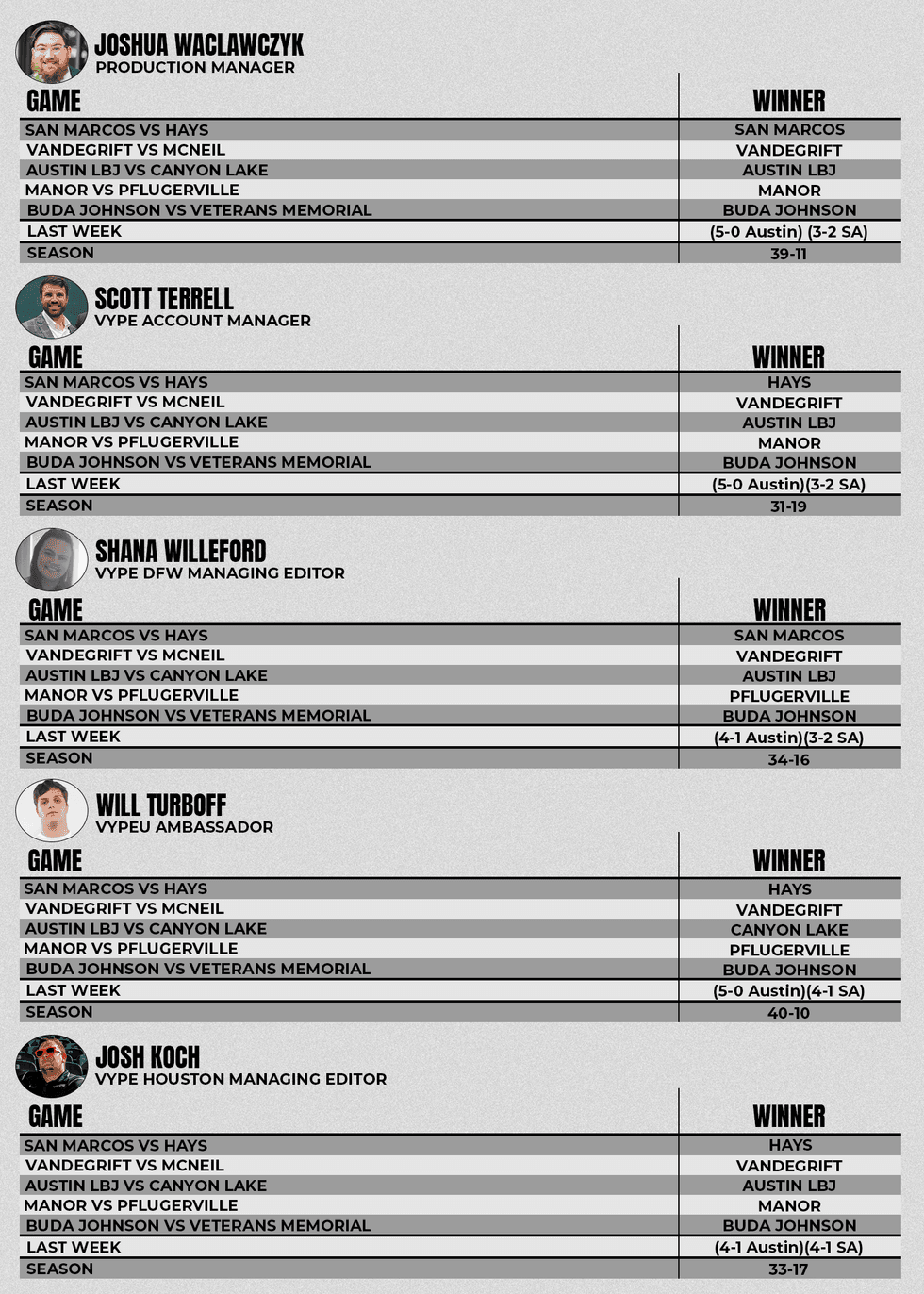 Each week, VYPE Employees Josh W., Scott, Shana and Josh K, along with VYPEU Ambassador Will Turboff will make their picks from 5 different games for both Austin and San Antonio and keep track of their records throughout the year to see who can be the Pick 'em Champ.