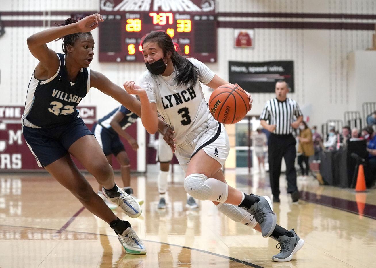 Dallas Bishop Lynch's Natalie Cardenas (3) drives the lane against The Village School's RyLee Grays (32) during the TAPPS 6A girls basketball championship game at A&M Consolidated High School in College Station, Texas on Friday, March 12, 2021.