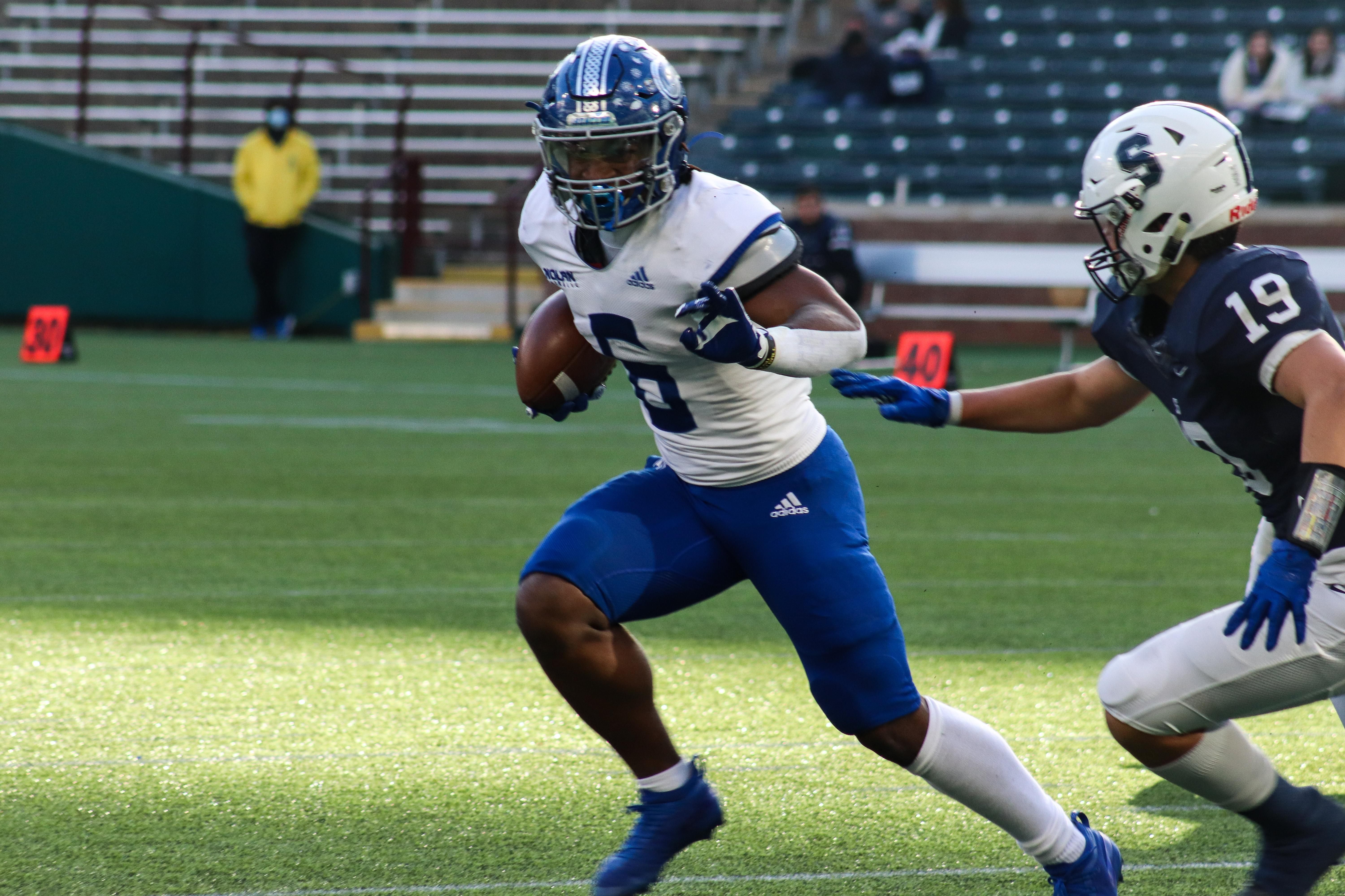 Emeka Megwa (6) dodges a tackle from an All Saints Episcopal School athlete during the TAPPS State Semi-Final at Globe Life Park (12/05/2020).