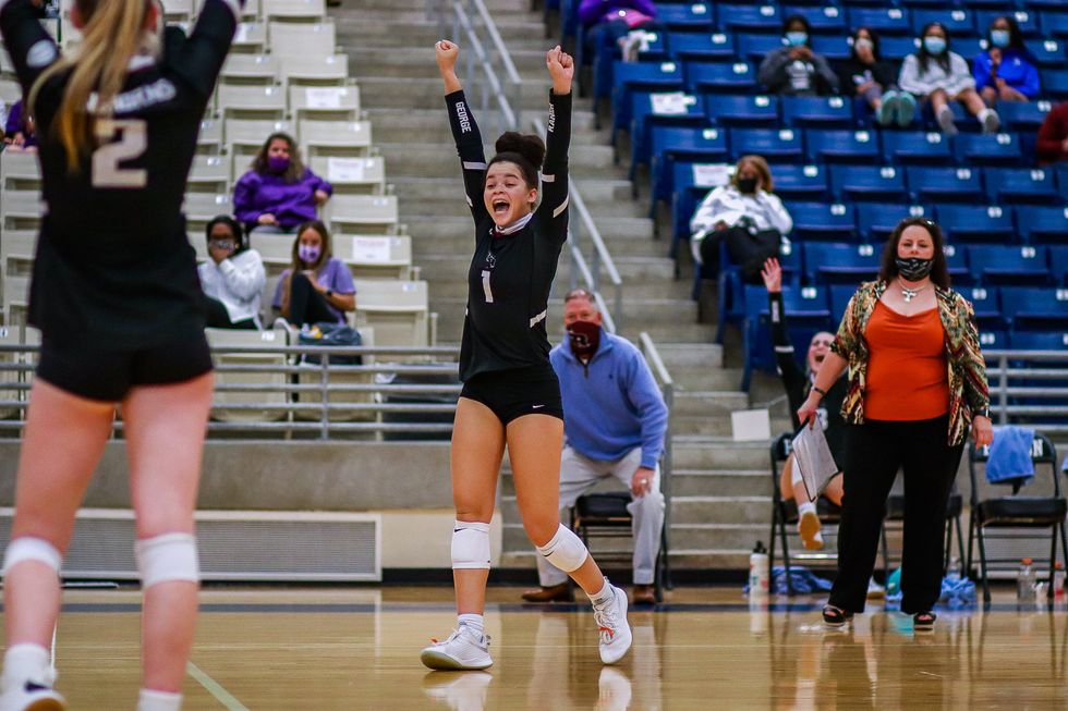 No. 1 Alex Tennon (12) and her team filled with true happiness after winning the fourth set of the match which ended up tieing the two teams.