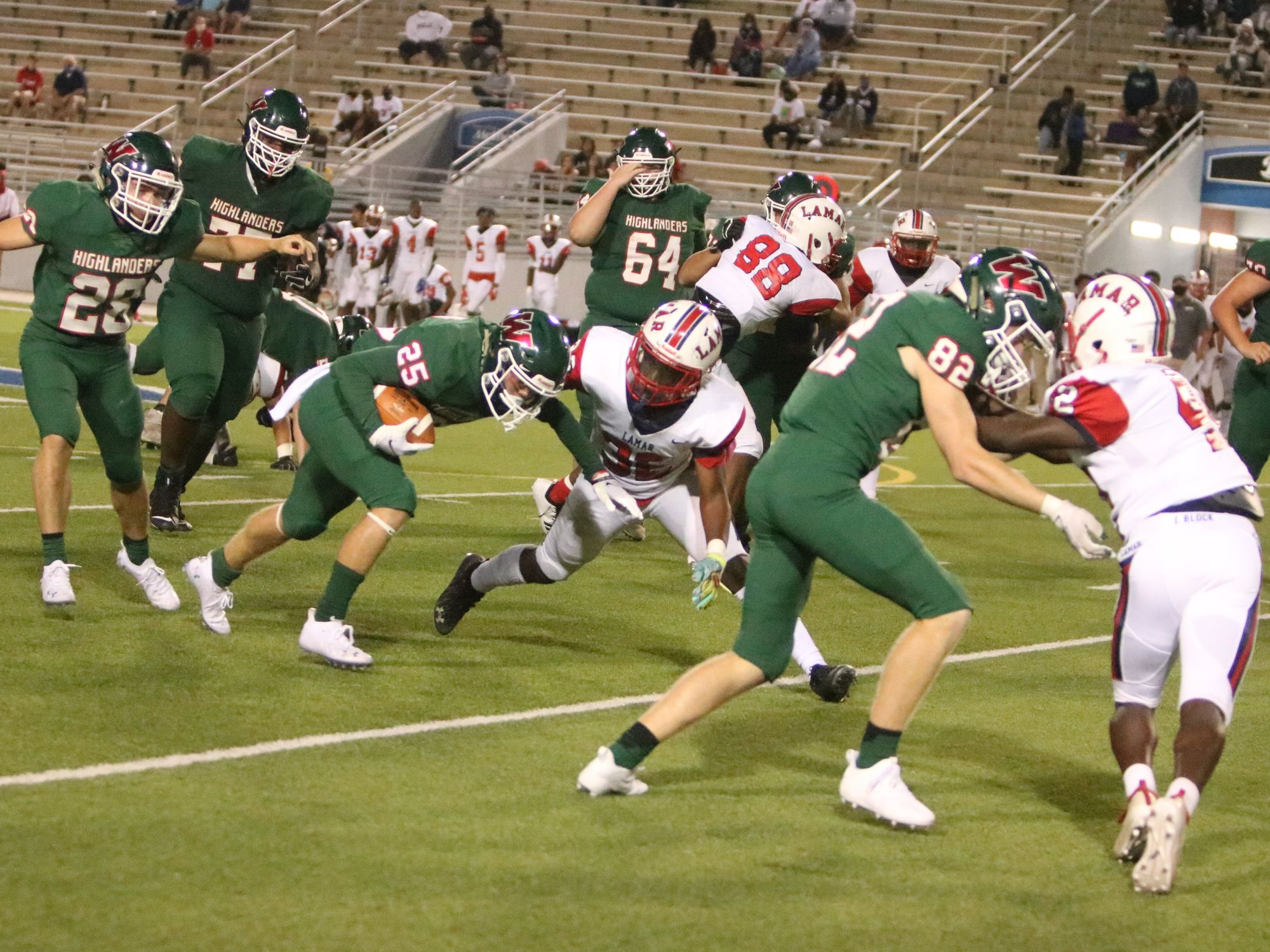 The Woodlands hosted Lamar Friday October 2nd at 7 PM at the Woodforest Bank Stadium. It was Senior night for the Highlanders, in which every Senior who participated in the game including the football players, cheerleaders, high steppers, band, and color guard wore a sash during their appearances on the field. The Highlanders came out on top 40-14 over the Texans.