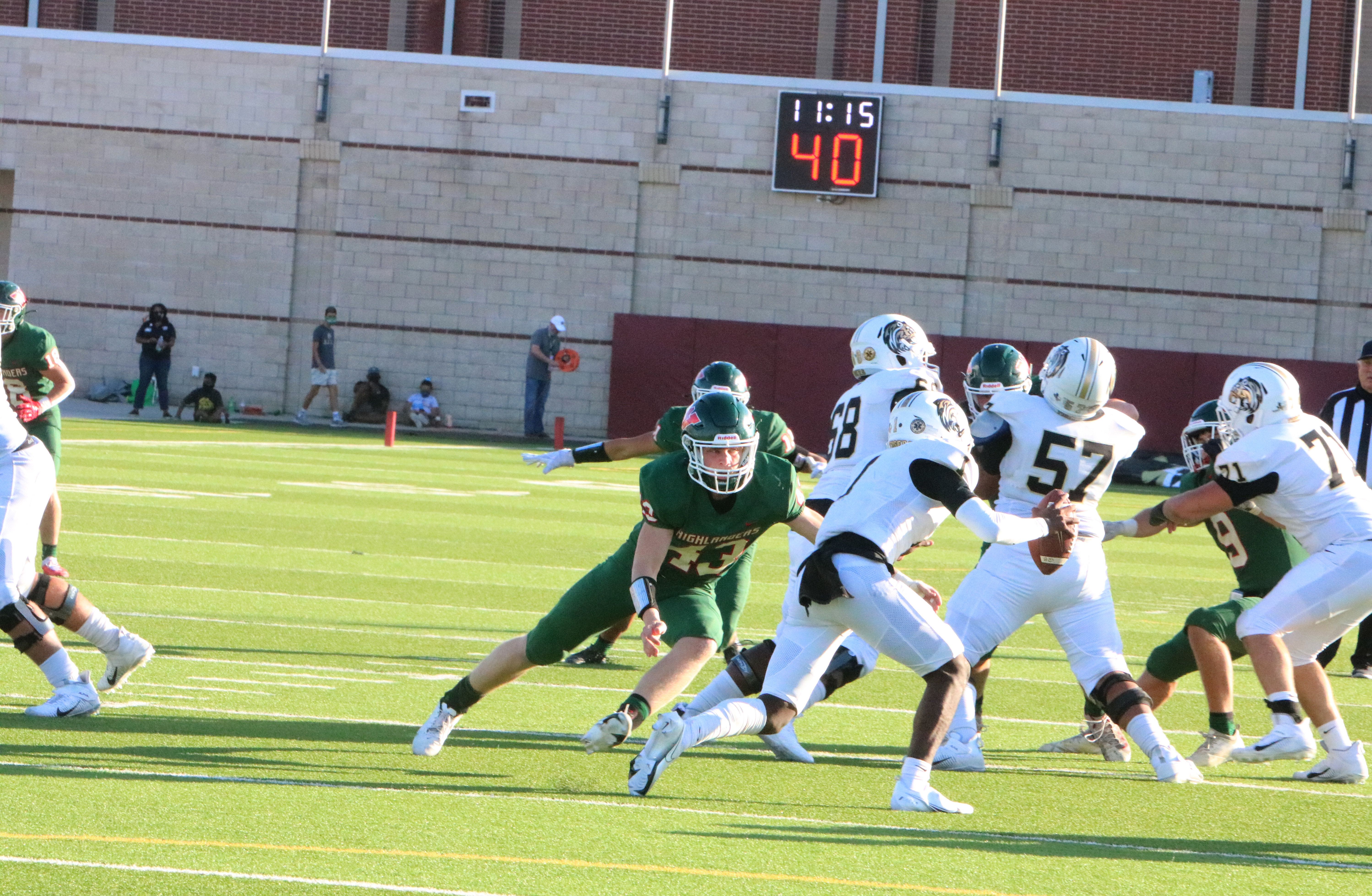 In the second quarter, the Highlanders picked up momentum scoring their first touchdown ran by freshman Mabrey Mettauer after a 60 yard connection from Conner Dechiro to Teddy Knox. Along with the extra point, the Highlanders were up 10-7. Conroe then scored its second touchdown, along with the extra point, putting the Tigers up 10-14. After a sack fumble, Conroe scored its third touchdown of the day with the extra point, putting the Tigers on top 10-21. The Highlanders then scored their own touchdown with a 24 yard touchdown pass from Dechiro to Knox, along with the extra point for a 17-21 halftime score.