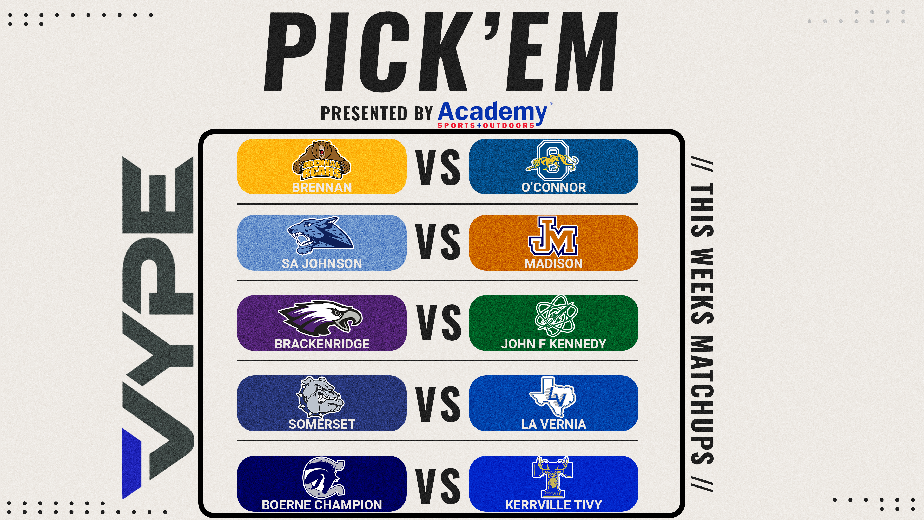 Each week, VYPE Employees Josh W., Scott, Shana and Josh K, along with VYPEU Ambassador Will Turboff will make their picks from 5 different games for both Austin and San Antonio and keep track of their records throughout the year to see who can be the Pick 'em Champ.