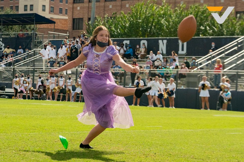 While the football team got ready to go out for warmups, another pregame devotional was taking place, this time in a comfy media room upstairs where the Golden Girls were meeting. One of the team members, Cate Calderon '23, took her bible to the front and started.