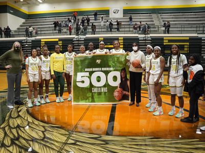 The win marked DeSoto head girls basketball coach Andrea Robinson's 500th career win.