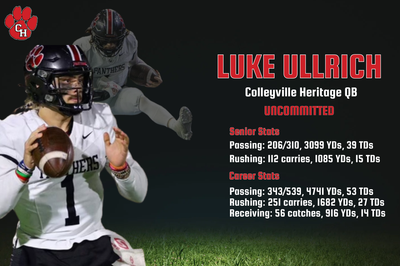 During his time with Colleyville Heritage, Ullrich has put up quite the stat line. Throughout his career, this 5'10 athlete has seen every angle of the ball while recording stats that would easily draw attention from all corners of the country. Ullrich has recorded 343 passes (in 539 attempts) for 4,741 passing yards and 53 passing touchdowns, 251 carries for 1,682 rushing yards and 27 rushing touchdowns, and 56 catches for 916 receiving yards and 14 receiving touchdowns. His senior season accounted for 206/310 pass completions, 3,099 passing yards, 39 passing touchdowns, 112 carries, 1,085 rushing yards, and 15 rushing touchdowns while leading his team to a 12-2 overall record (7-0 in district play) and the quarterfinal round of the UIL Class 5A D2 playoffs.
