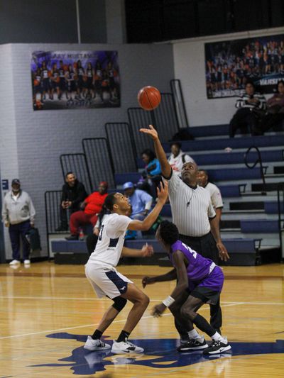 #23 Khalil Wells and #33 Jordan Stanley-Pickett jump for the first possession in overtime.
