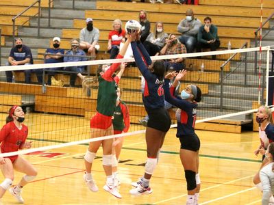 Sophomores Mackenzie Weddel and Marjorie Johnson block Dawson's outside hitter from the right side.