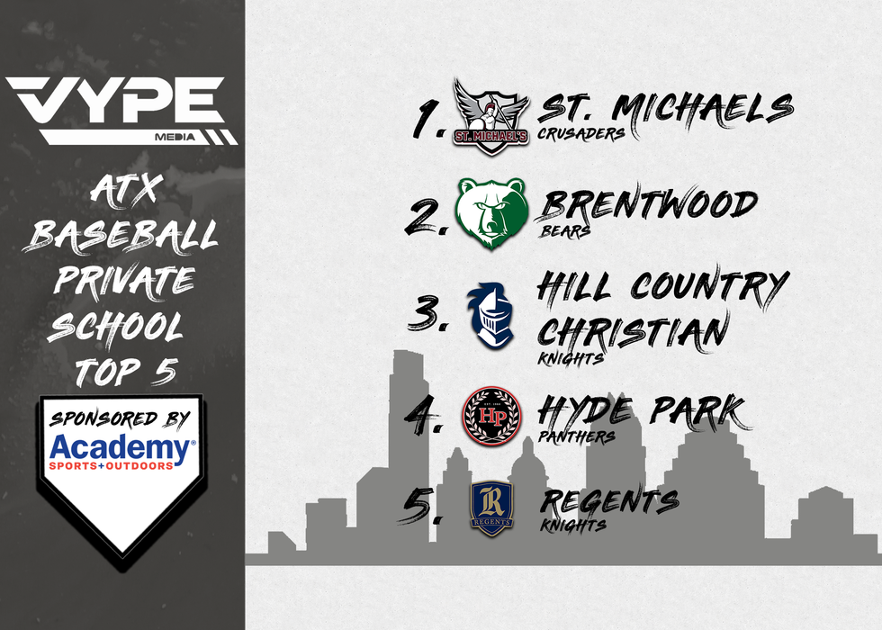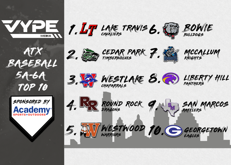 Each week VYPE's Joshua Waclawczyk and Scott Terrell will bring you their rankings of the top Baseball and Softball programs in the area broken up into 5A-6A, 1A-4A, and Private Schools. Will you agree with our rankings? Most assuredly not. After all, these are just our opinions and we are sure there are much smarter people out there that may have better rankings. So if you have your own thoughts on these rankings let us know on Twitter (@vypeatx) and Instagram (@vype_atx).