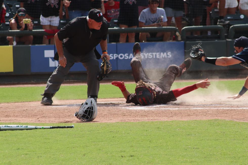 Rockwall-Heath baseball players celebrate after a run crosses the plate in the 2021 UIL Class 6A State Title game against Keller (2021).