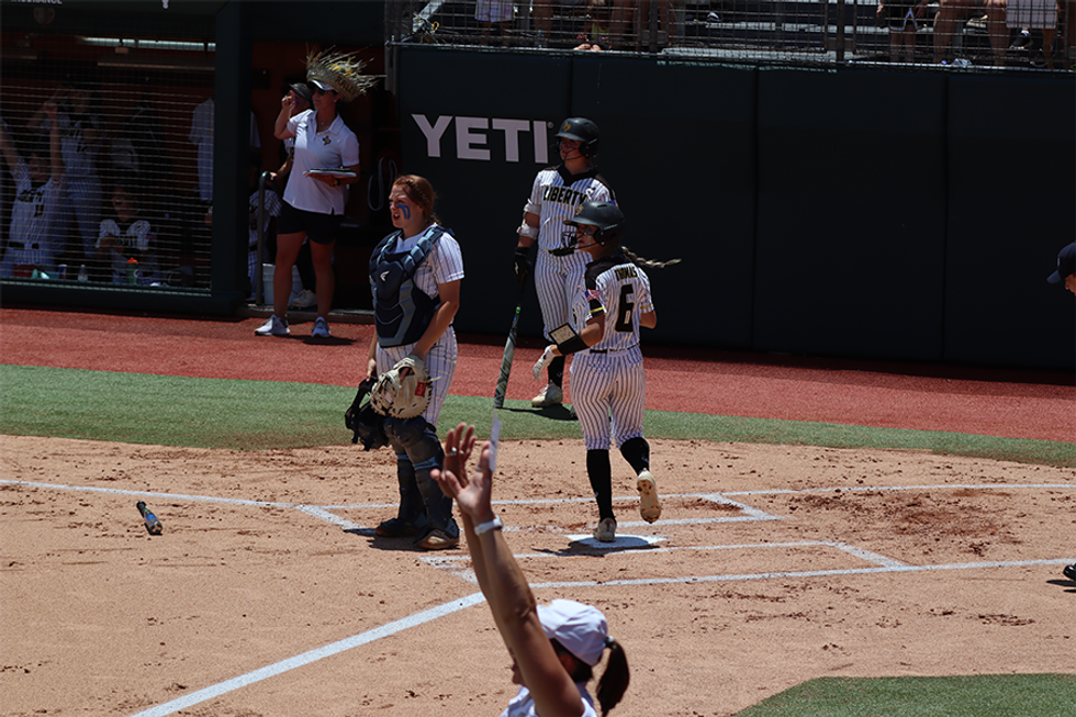 Liberty's Kylie Bishop doubles to left field, Hollie Thomas scores (5-0 Liberty)