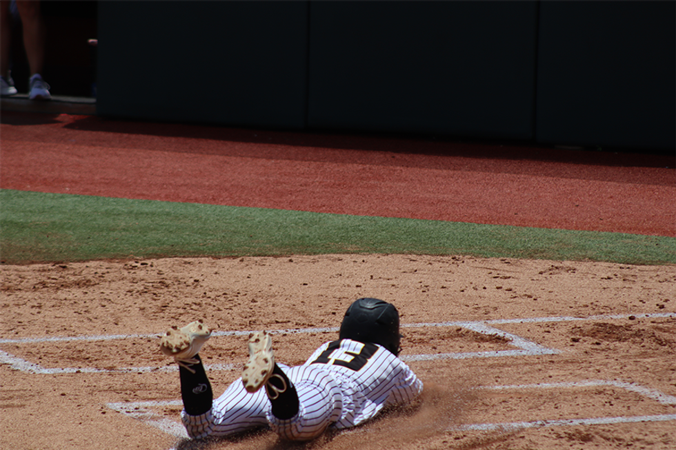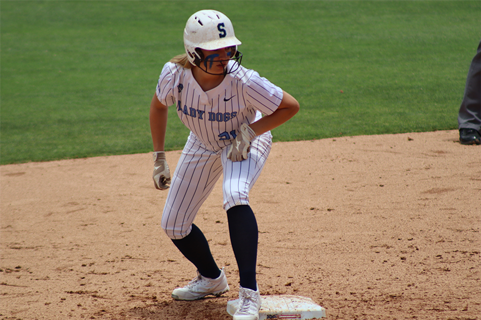 Liberty's Bailee Slack steals second and scores on a throwing error (4-0 Liberty)