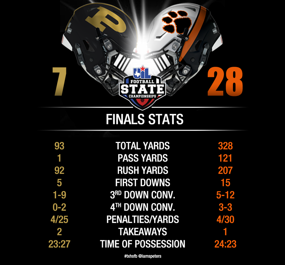 Shiner (13-0, Region IV champion) is in search of its third state championship but would be the program's first since 2004 - so it's been a while. Shiner enters averaging 50 points a game while holding opponents to just 11 per contest. The playoffs have seen Shiner run right through its opponents, outscoring teams 273-38.