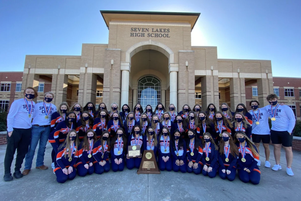 Seven Lakes High School (SLHS) Cheerleaders won the 2021 Conference 6A-D1 UIL State Spirit Championship, which took place in Fort Worth, Texas. Out of 43 6A-D1 schools, the Spartans took home the gold and the coveted title of being named "CHAMPIONS."