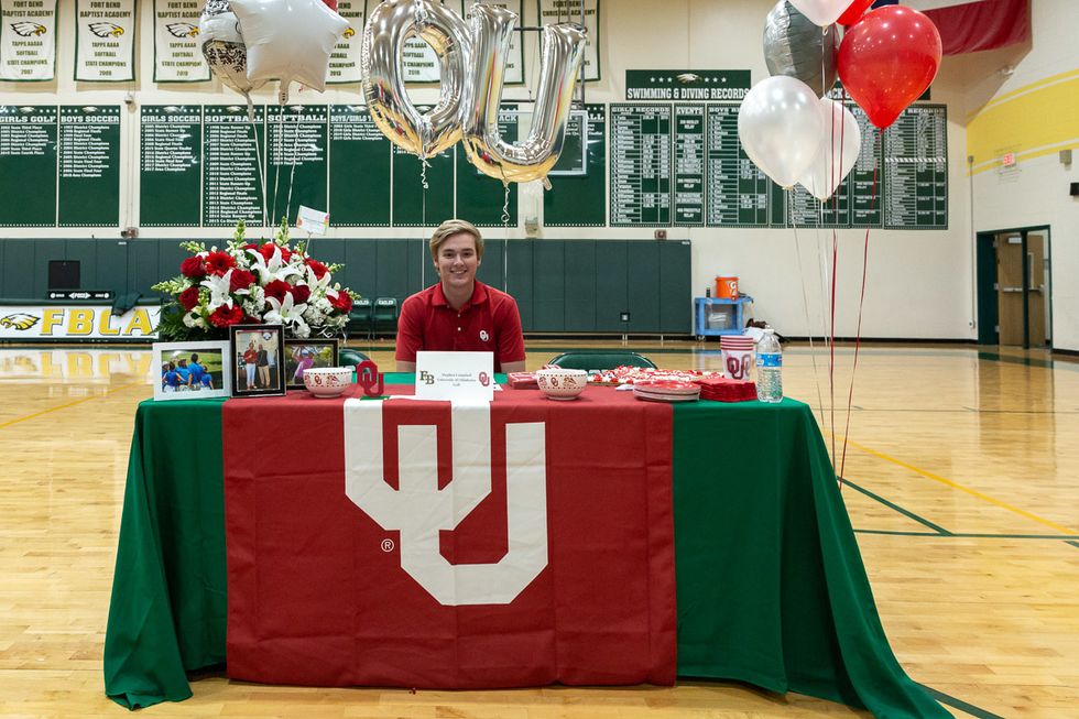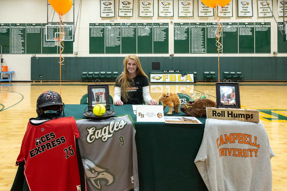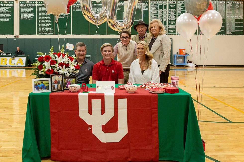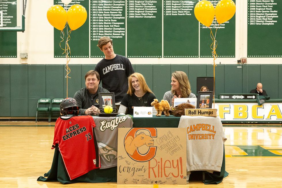 Five student-athletes put pen to paper making their college choices official in a signing day ceremony at FBCA. The group included Jackie Jessup (Houston Baptist University Softball), Kadem Kram (Trinity University Baseball), Riley Cargile (Campbell University Softball), Sarah Kmiecek (UMHB Golf) and Stephen Campbell (University of Oklahoma Golf). Photos courtesy of Fort Bend Christian Academy.