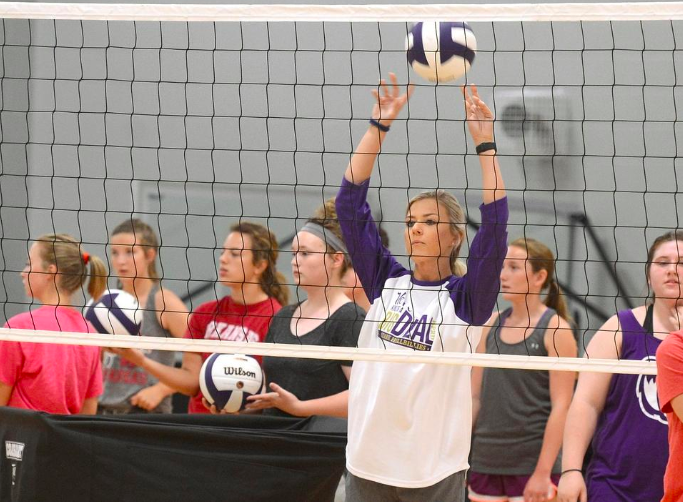 Ozark volleyball coach Kelsey Webb runs the team through drills as they prepared for the start of last season in the Ozark Community Center on, June 20,2018. This will be the second season for the volleyball program at the school.