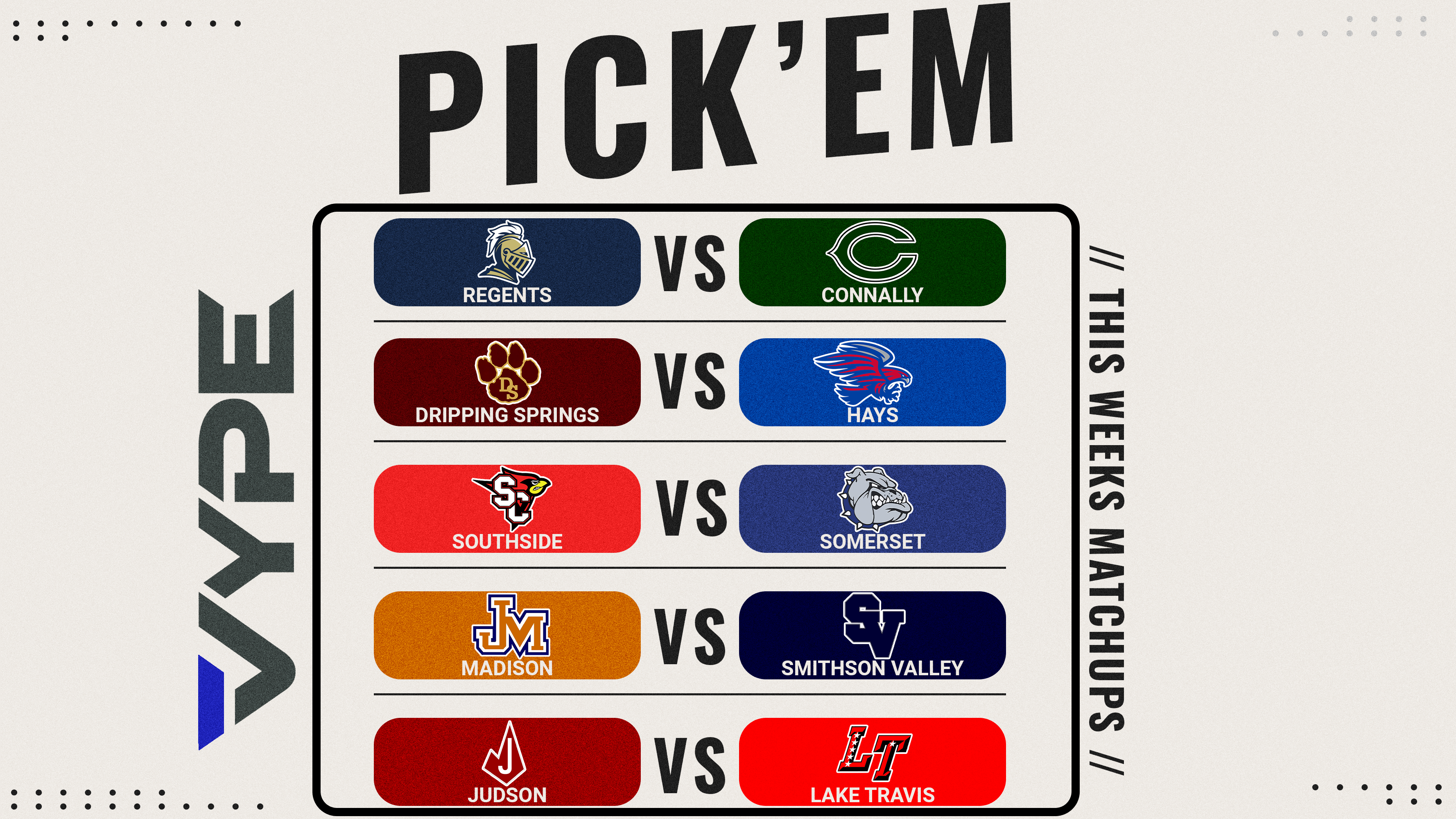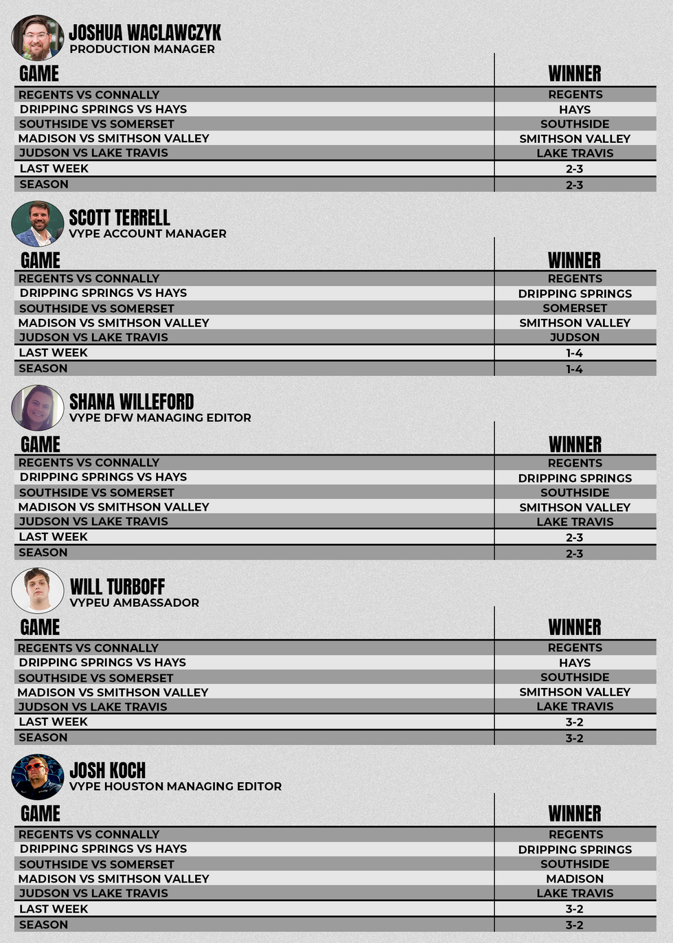 Each week, VYPE Employees Josh W., Scott, Shana and Josh K, along with VYPEU Ambassador Will Turboff will make their picks from 5 different games and keep track of their records throughout the year to see who can be the Pick 'em Champ. Will and Josh K lead after Week 1 picking 3 of the 5 games correctly. Can the rest of the squad get above .500? Check out their picks this week.