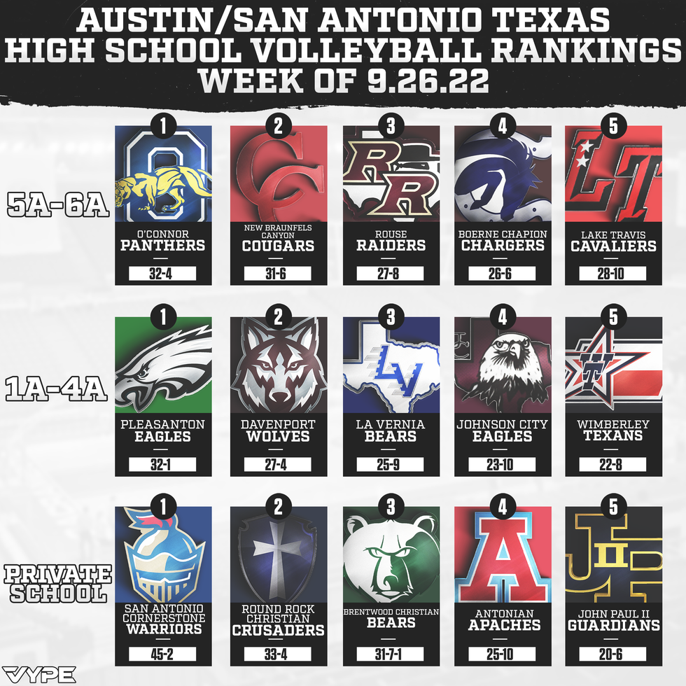 Private School: 4 of the 5 schools stay the same with arguably the best team in the state at the Number 1 spot. John Paul II replaces Hill Country School of Austin to jump back in after being out the last few weeks.