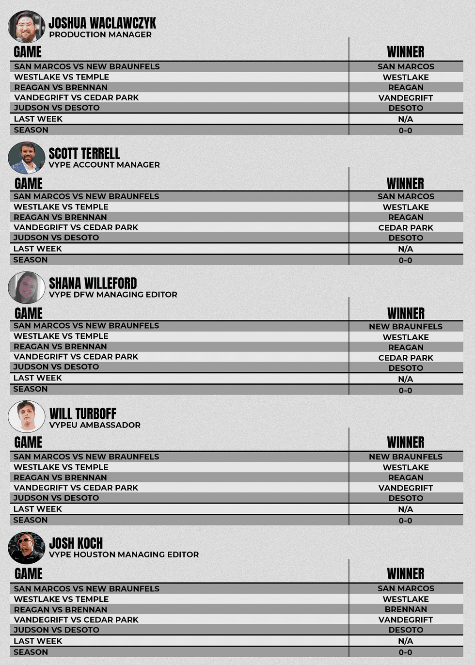 Each week VYPE Employees Josh W., Scott, Shana and Josh K, along with VYPEU Ambassador Will Turboff will make their picks from 5 different games and keep track of their records throughout the year to see who can be the Pick 'em Champ.