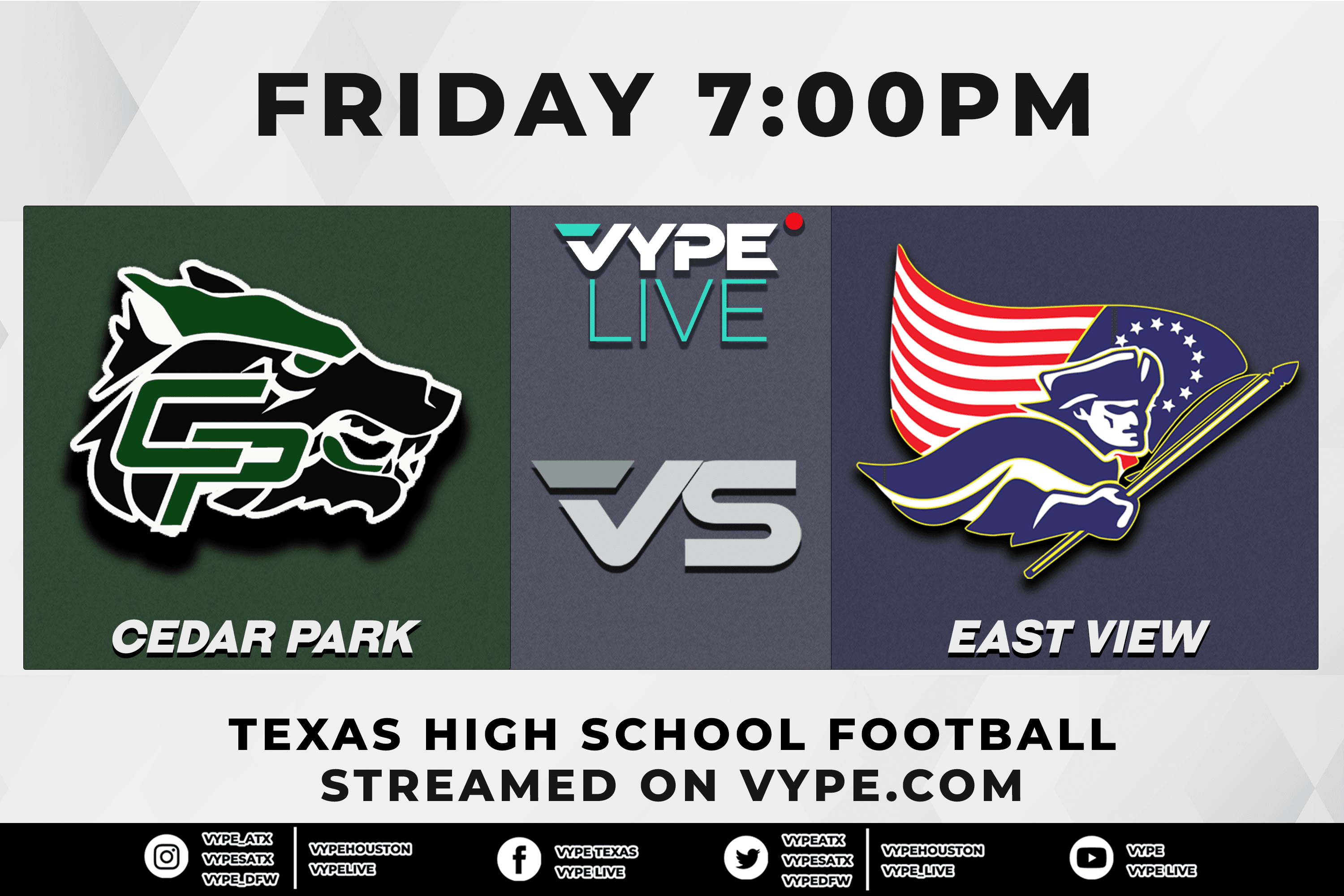 VYPE Live - Football: Cedar Park vs. East View VYPE LiveSep 21, 2022CLICK HERE TO PURCHASE TICKET TO WATCH LIVE with BRAD CONE, JOSH WILLARD & CECIL COCONOUGHER!EAST VIEW FANS - CLICK HERE TO WATCH
