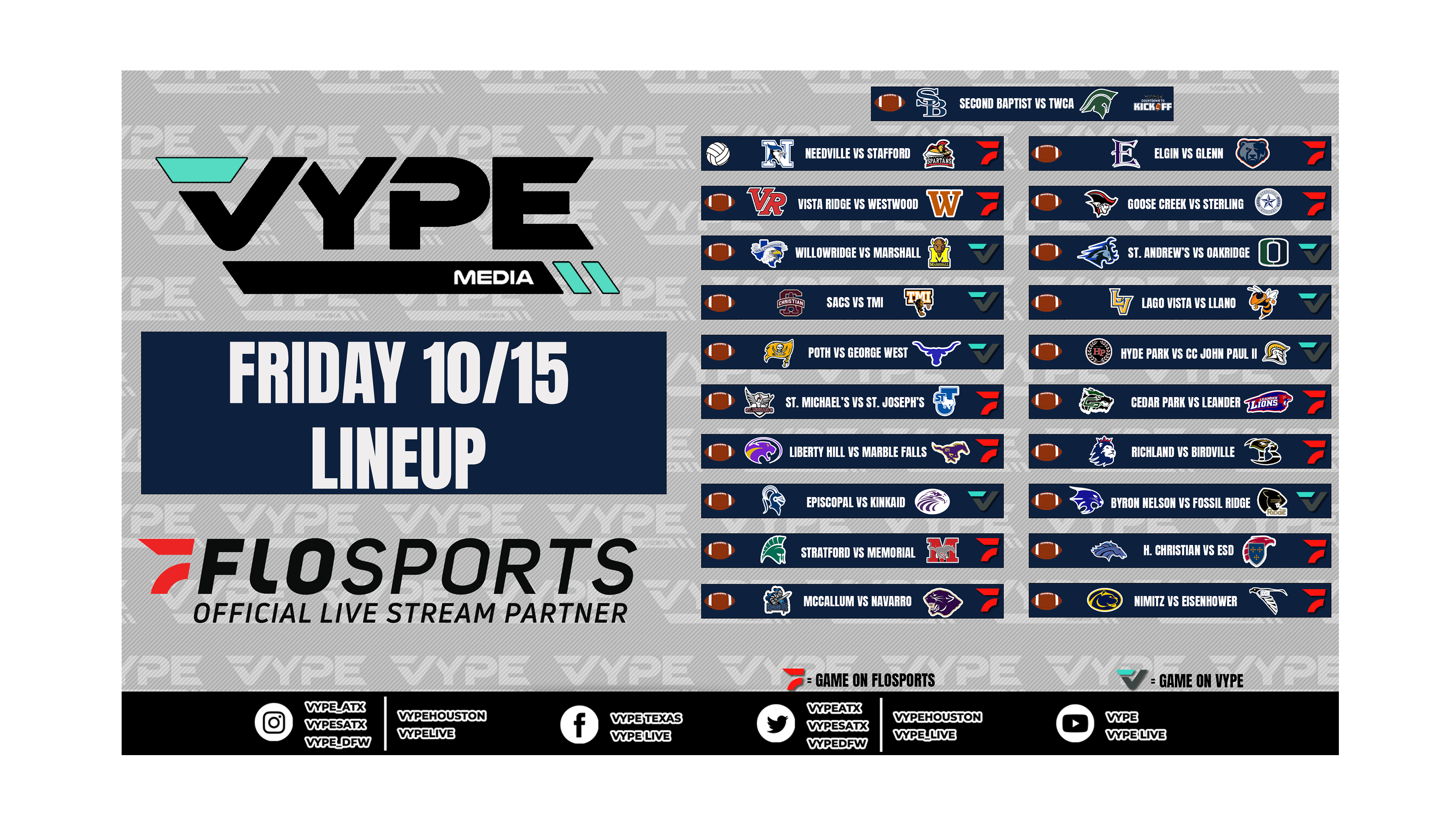 Join our VYPE Live crews for these Texas High School match-ups on Friday, October 15: