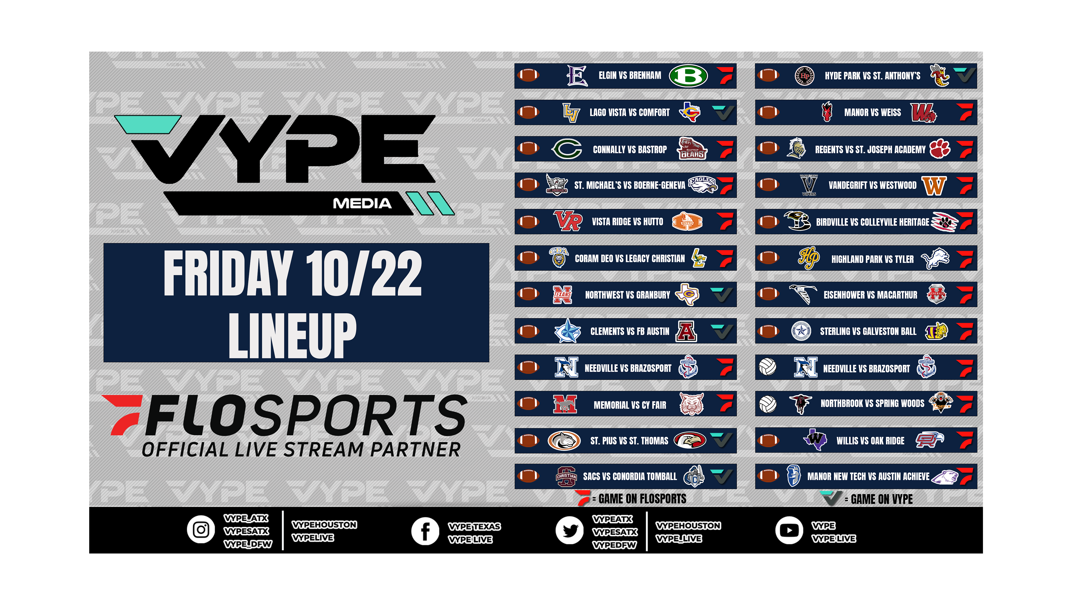 Join our VYPE Live crews for these Texas High School match-ups on Friday, October 22: