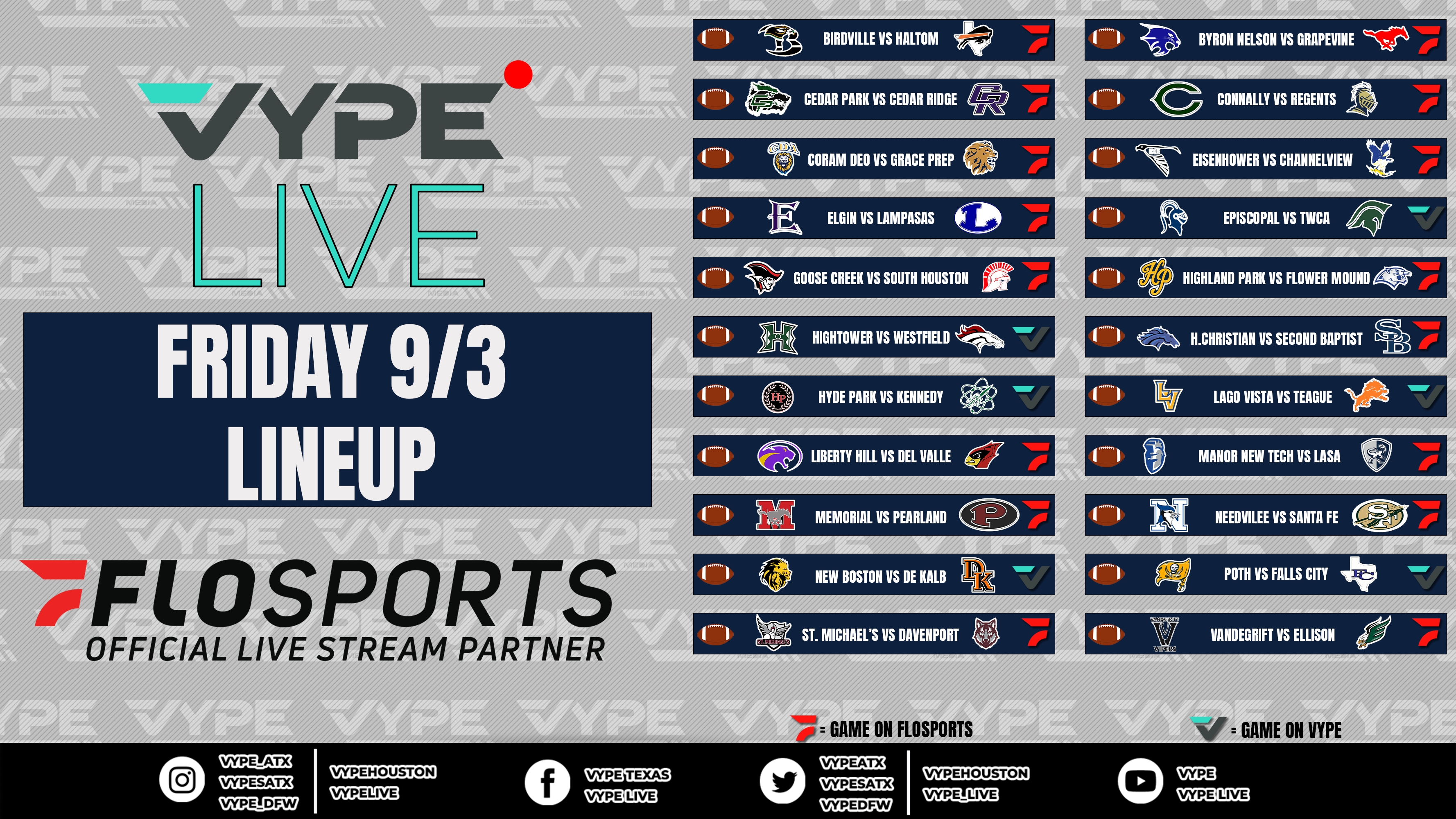 Join our VYPE Live crews for these Texas High School Football match-ups on Friday, September 3: