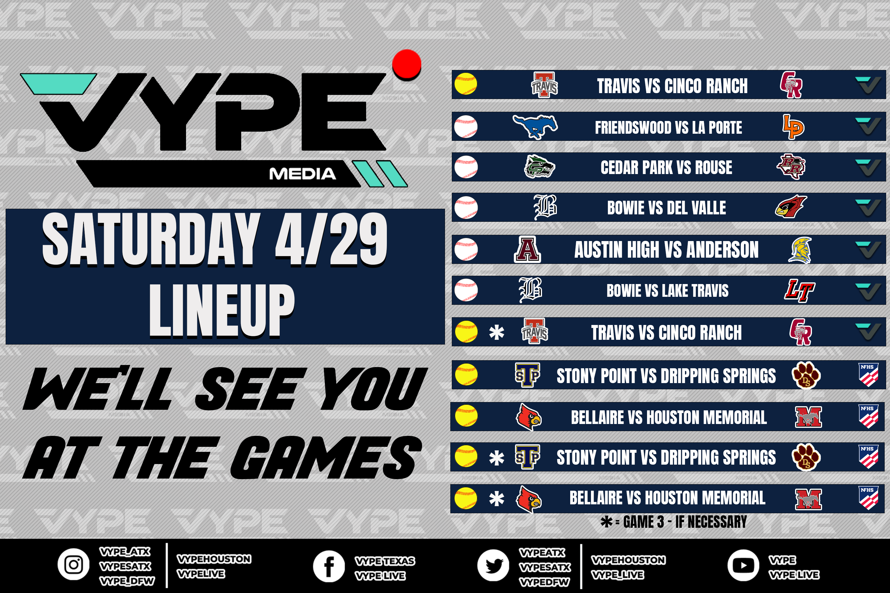 VYPE Live Lineup - Saturday 4/29/23 VYPE LiveApr 29, 2023THE FULL LINEUP IS BELOW THE AD-SCROLL DOWN TO FIND YOUR MATCH-UP AND CLICK THE IMAGE TO WATCH YOUR GAME LIVE!vype livesaturdaytraviscinco ranchfriendswoodla portecedar parkrousebowiedel valleaustin highandersonlake travisstony pointdripping springsbellairehouston memoriallineup