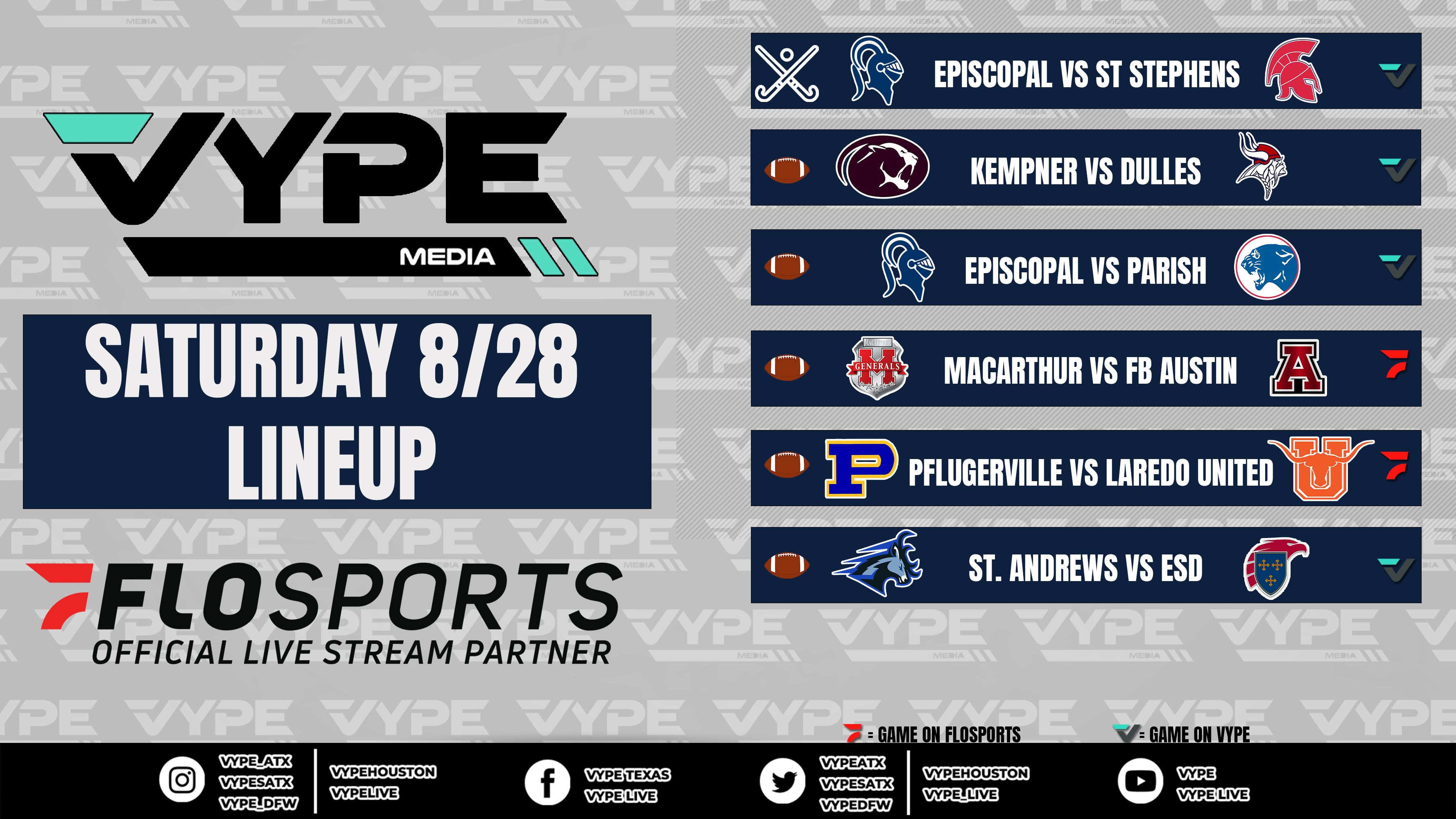 Join our VYPE Live crews for the following Texas High School Football (and Field Hockey) match-ups on Saturday, August 28: