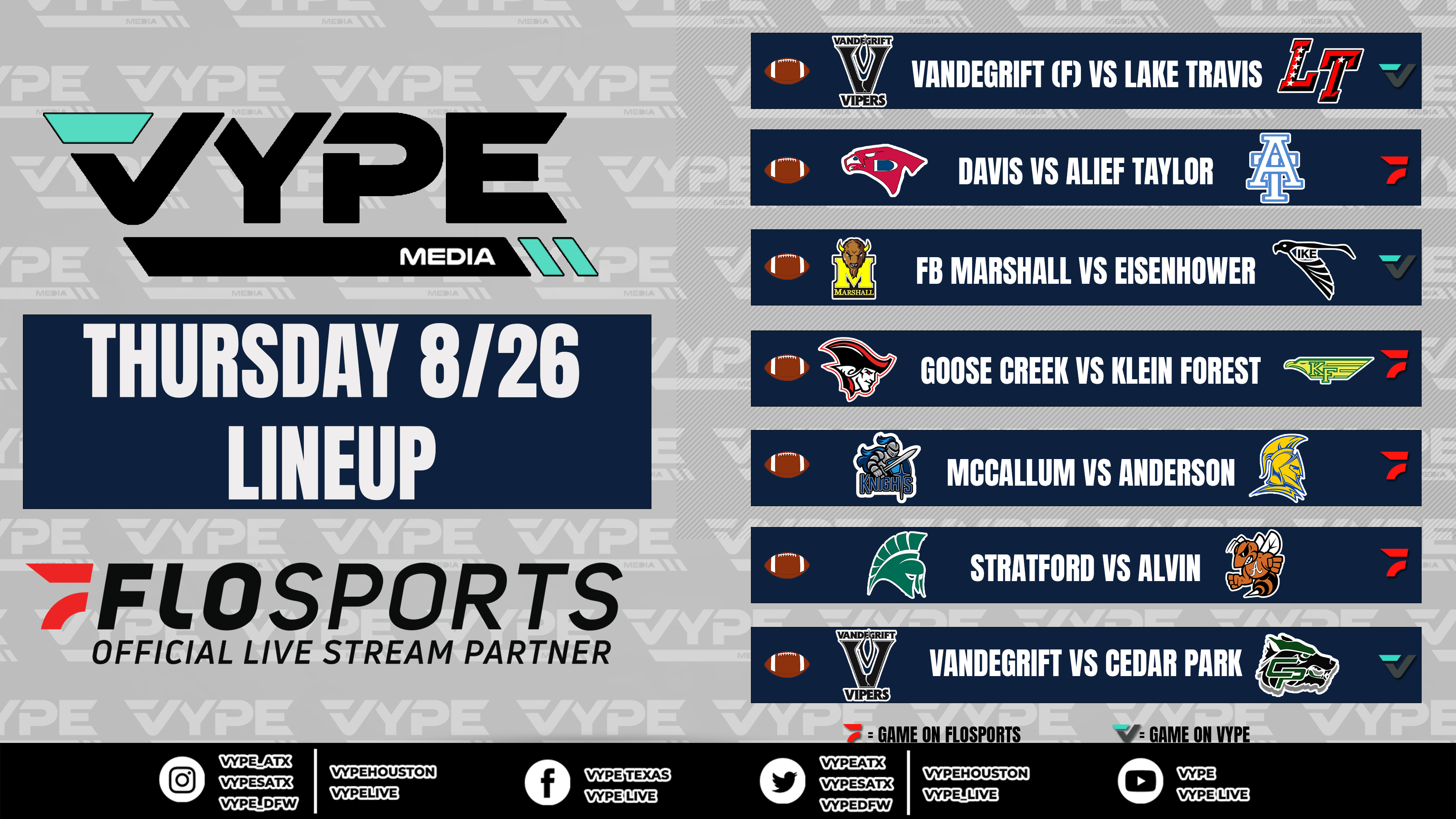 Join our VYPE Live crews for the following Texas High School Football match-ups on Thursday, August 26: