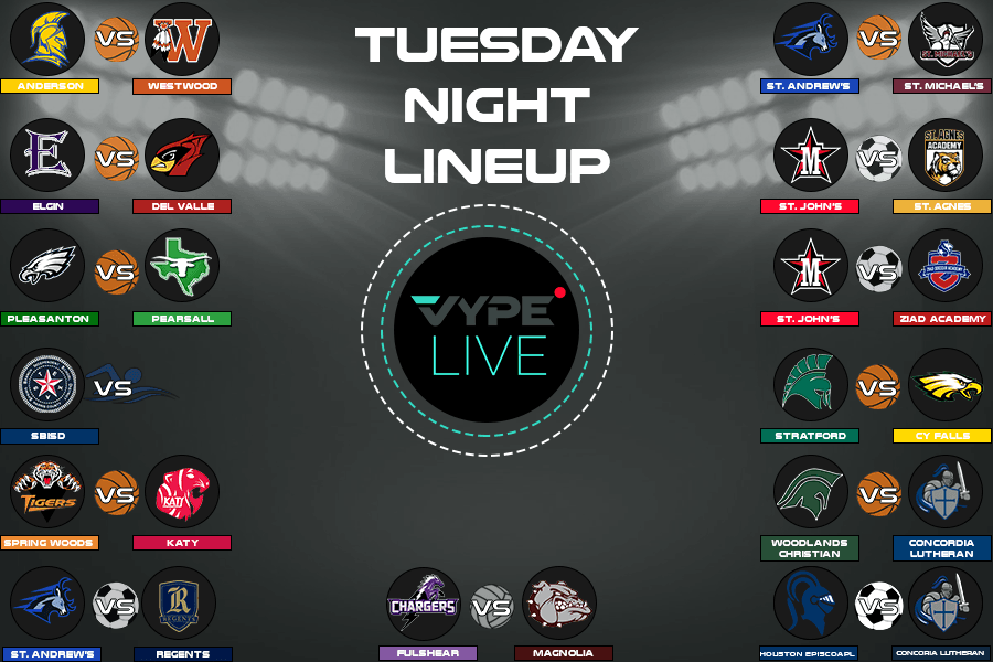 VYPE Live Lineup - Tuesday 12/1/20 VYPE Live Dec 01, 2020 5PM/7PM - Soccer: Episcopal vs. Concordia Lutheran 5PM/7PM - Soccer: St. Andrews vs. Regents 5PM - JV Girls Soccer: St. John's vs St. Agnes 5:15/6:30/8PM - Boys Basketball: St. Andrews vs. St. Michael's 6PM - 5A Reg III Semifinal Volleyball: Fulshear vs. Magnolia 6PM - Swim Meet: Spring Branch ISD Invitational 6:30PM - Girls Basketball: Elgin vs. Del Valle 7PM - JV Boys Soccer: St. John's vs. Ziad Academy 7PM - Girls Basketball: Stratford vs. Cy Falls 7PM - Boys Basketball: Spring Woods vs. Katy 7:30PM - Girls Basketball: Pleasanton vs. Pearsall 7:30PM - Boys Basketball: TWCA vs. Concordia Lutheran 7:30PM - Talk Show: Timberwolf Night in America 8PM - Boys Basketball: Anderson vs. Westwood Keep reading... Show less