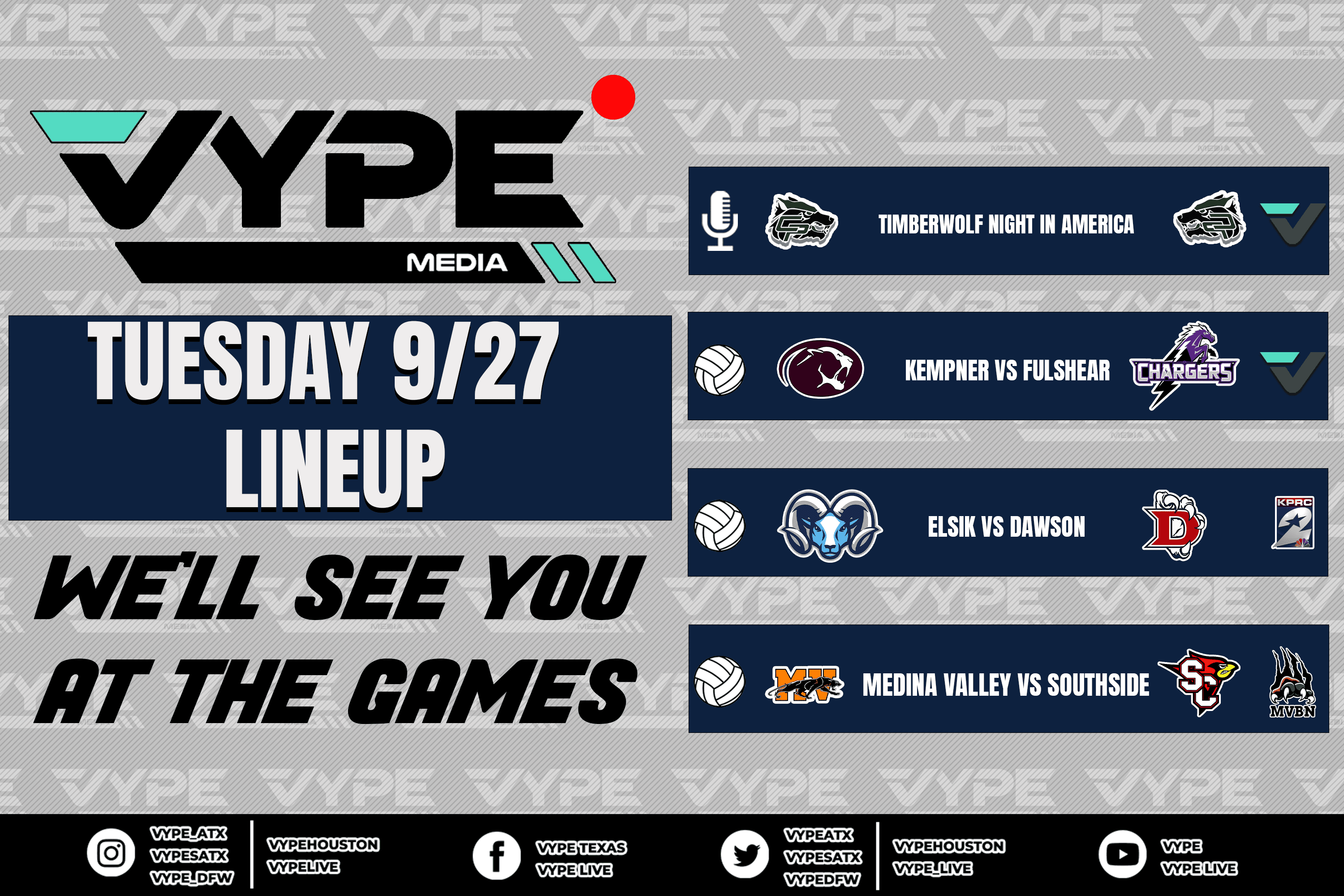 VYPE Live Lineup - Tuesday 9/27/22 VYPE LiveSep 27, 2022THE FULL LINEUP IS BELOW THE AD-SCROLL DOWN TO FIND YOUR MATCH-UP AND CLICK THE IMAGE TO WATCH YOUR GAME LIVE!