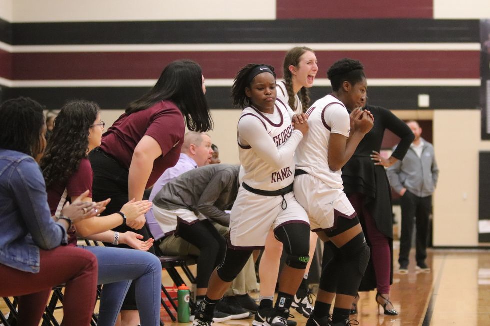 Nyah Swafford being swarmed by her excited team after the game ended with a final score of 71-38.