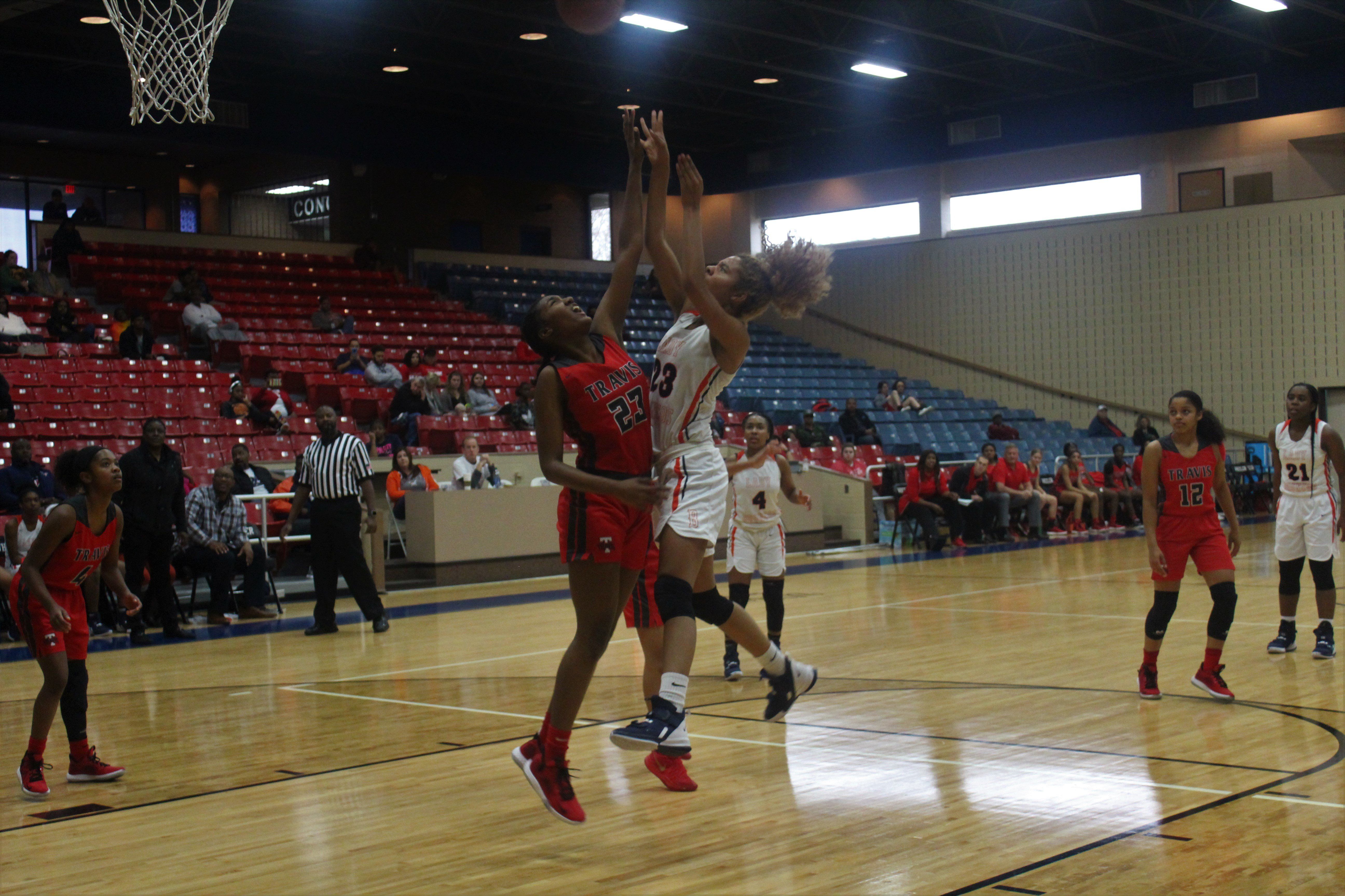 George Bush Lady Broncos defeated Travis Lady Tigers (58-48)! Leading the way for the Lady Broncos was A. Sturdivant (#21) w/ 20 points, C. Thomas (#23) w/ 15 points, and D. Vigilante (#4) w/ 11 points.