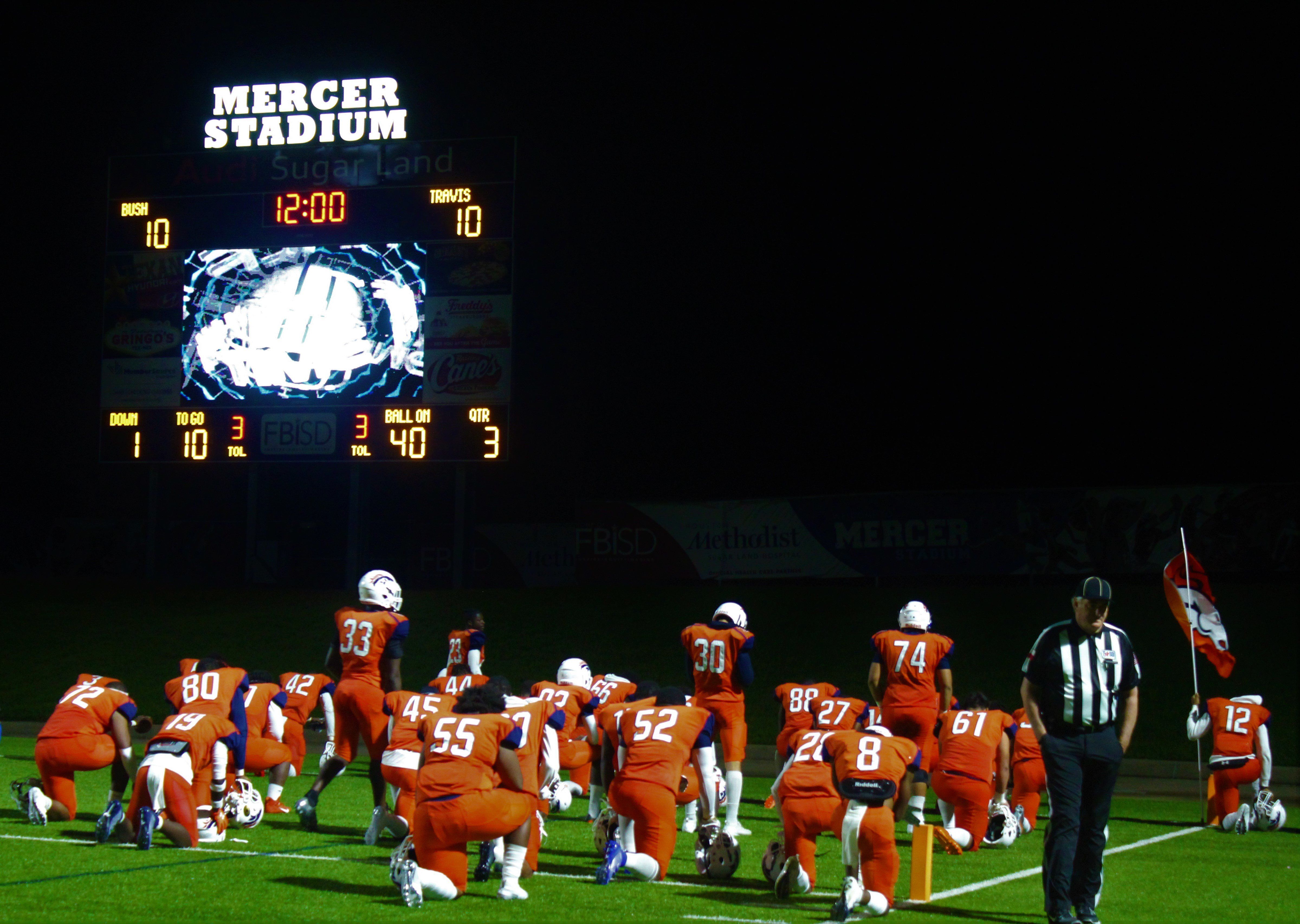 Broncos at halftime praying before the begin 2nd half of game.